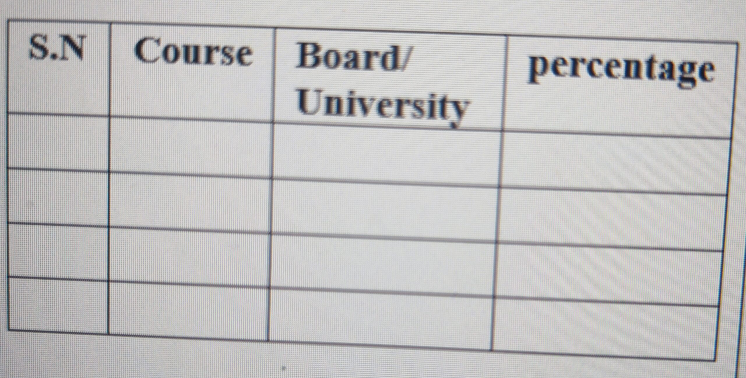 S.NO    COURSE  BOARD/ UNIVERSITY  PERCENTAGE
