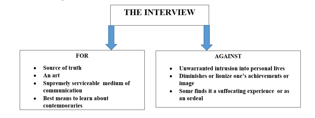 Ans: people vary in their opinions on interviews. some consider interviews as a source of truth. They are the most important means of getting impressions of our contemporaries. They are a supreme serviceable medium of communication. Others despise interviews as they consider them as an unwarranted intrusion into their lives. They feel that an interview diminishes or lionizes them.